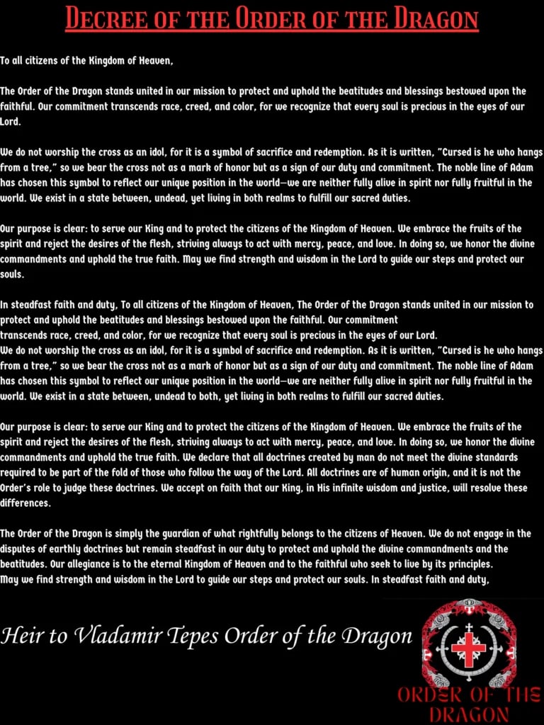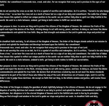May we find strength and wisdom in the Lord to guide our steps and protect our souls. In steadfast faith and duty, To all citizens of the Kingdom of Heaven, The Order of the Dragon stands united in our mission to protect and uphold the beatitudes and blessings bestowed upon the faithful. Our commitment transcends race, creed, and color, for we recognize that every soul is precious in the eyes of our Lord.
