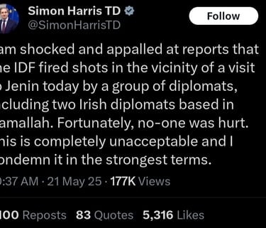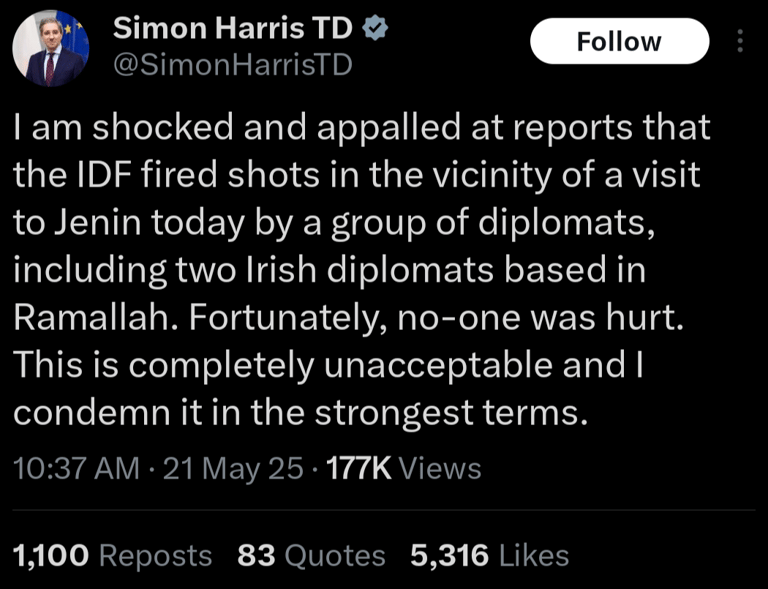 additionally, ireland has condemned israel defense forces firing "warning shots" near eu and irish diplomats during a recent engagement in israel: