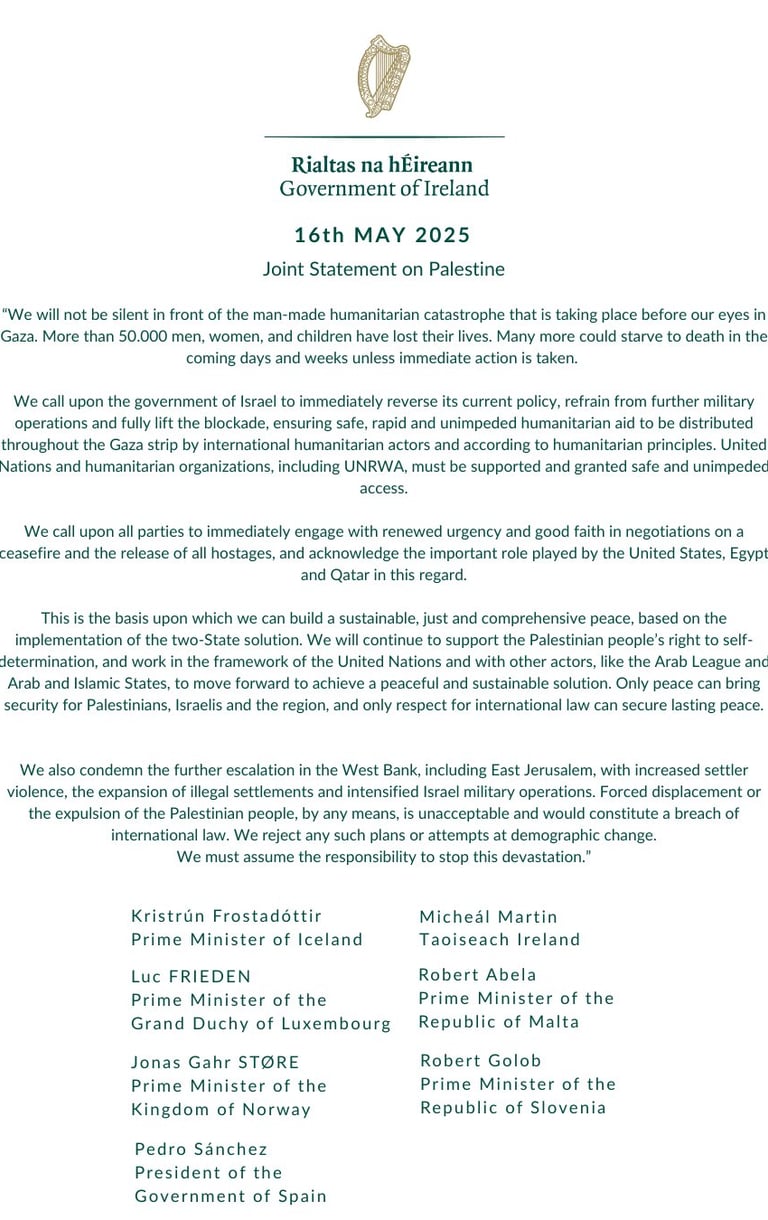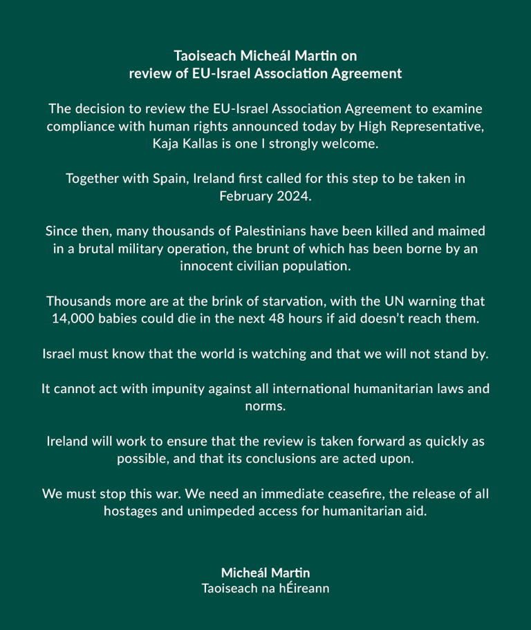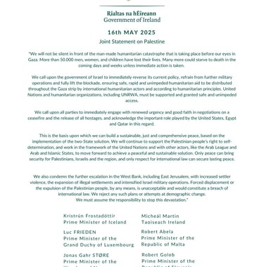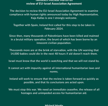 the prosecution of mo chara comes as ireland demands an end to a humanitarian crisis in gaza, including reports of severe starvation as israel limits food, medicine, and other supplies to gazans. ireland has issued statements attacking israel's attacks on gaza: