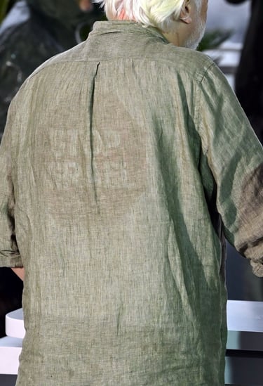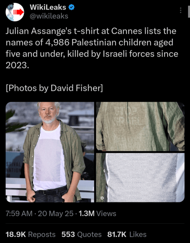 Julian assange recently wore a shirt with names of victims of the gaza genocide on the front and a stop sign logo with the words "stop israel" on the back while attending the cannes movie festival