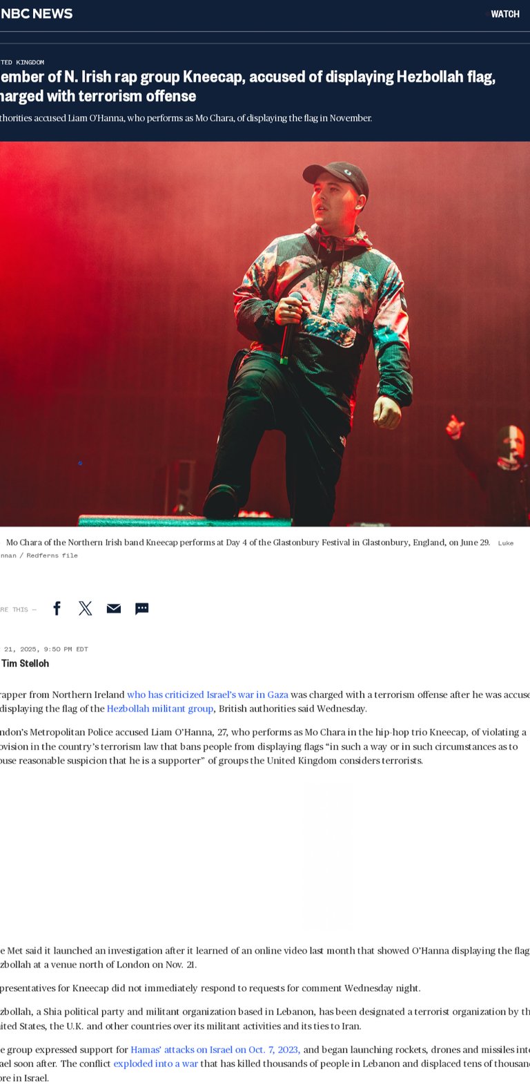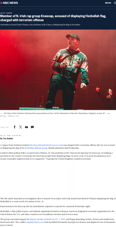 Mo Chara, a rapper for the Irish rap group Kneecap, was charged by the English government for terrorism crimes because he held up a flag associated with Hezbollah.